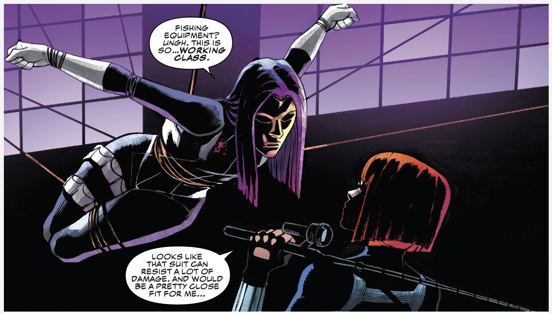 As one example, the creators of v.7 turn the tables on one of the most reductive ways Black Widow is portrayed—bound (and often nude or semi-nude):