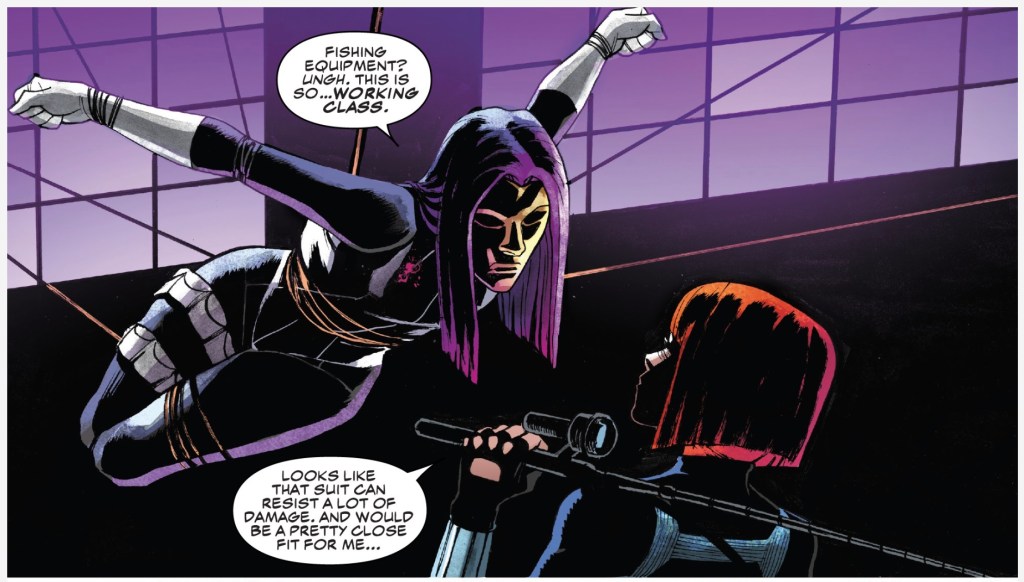How humans are portrayed in comic books has a long problematic history. Men and women alike are often drawn in distorted ways (particularly for me, the low point being the artistic style of the 1990s)—although women are more often than not hypersexualized. Black Widow has suffered that fate often, too often, so v.8 is an interesting way to interrogate women’s bodies, the gaze afforded readers when women are centered, and the role of clothing and fashion in depicting women superheroes.