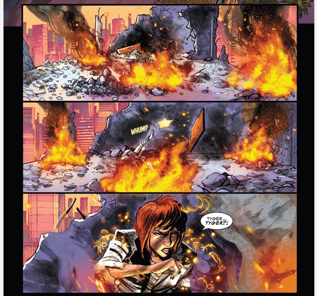 Identity and rebirth open the last issue of this series with Black Widow surviving a blast, portrayed with subtle phoenix imagery: