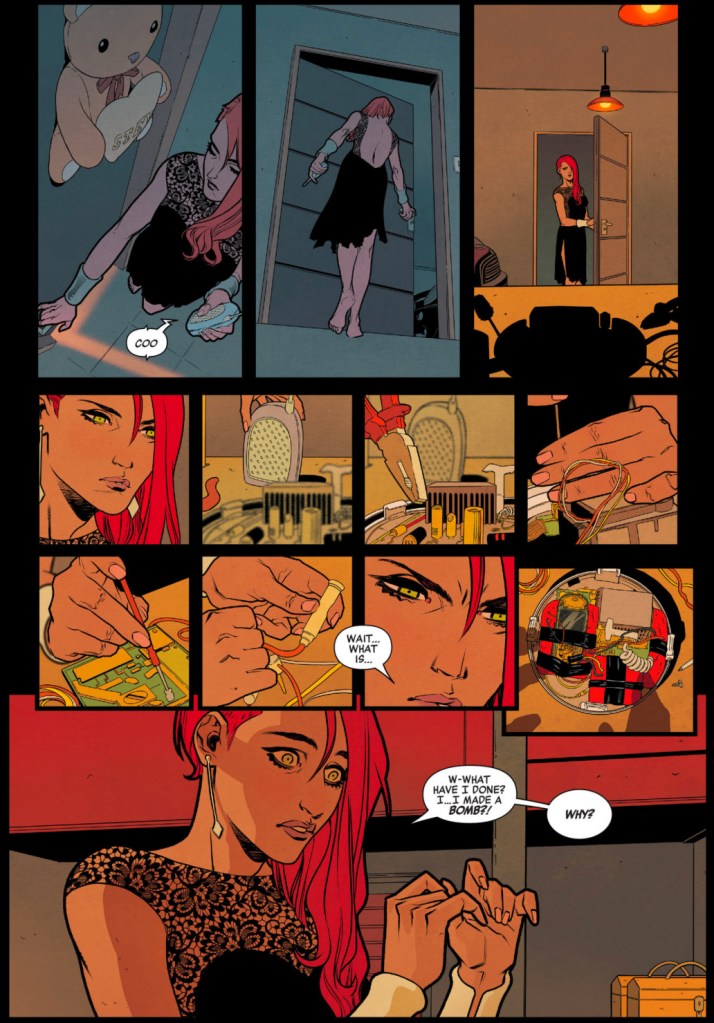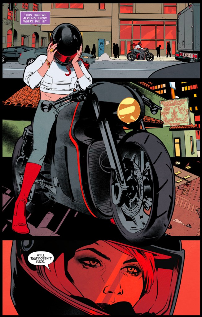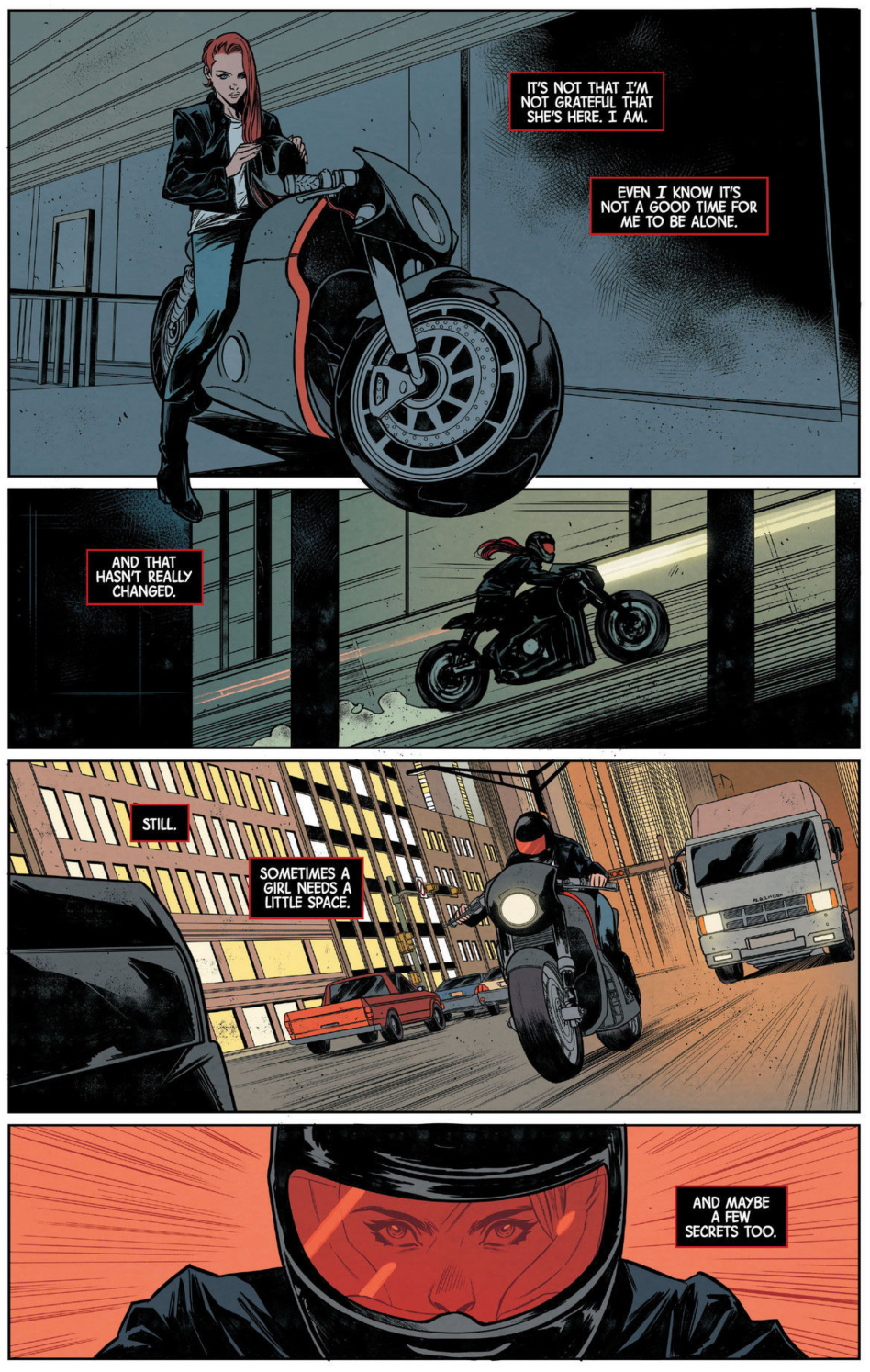 Another compelling aspects of issue 1 is watching Natasha/Black Widow resurface from the puzzling new life of Natalie (one Yelena, Clint, and Bucky gradually piece together). First, the motorcycle, and then, building a homemade bomb.