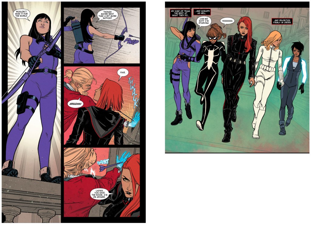 Issue 10 introduces another derivative woman superhero, Hawkeye, like Spider-Girl, but the assembling of a mostly women team remains a powerful aspect of this run. Natasha herself acknowledges this, suggesting a sense of community linked to their shared womanhood (even with a touch of her sarcasm).