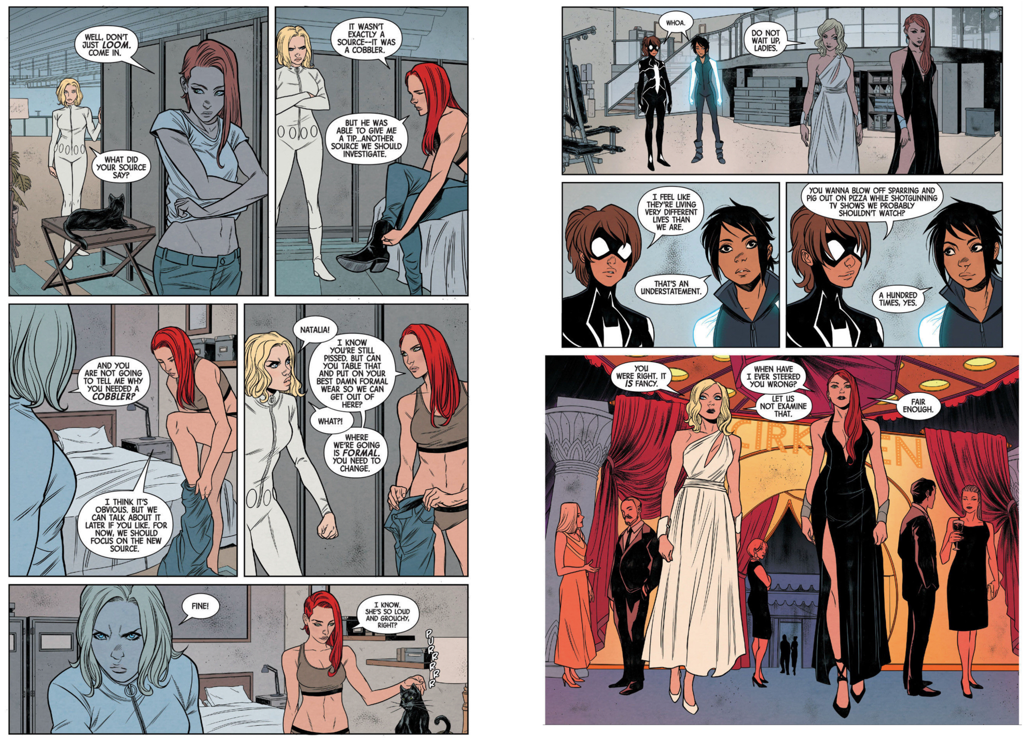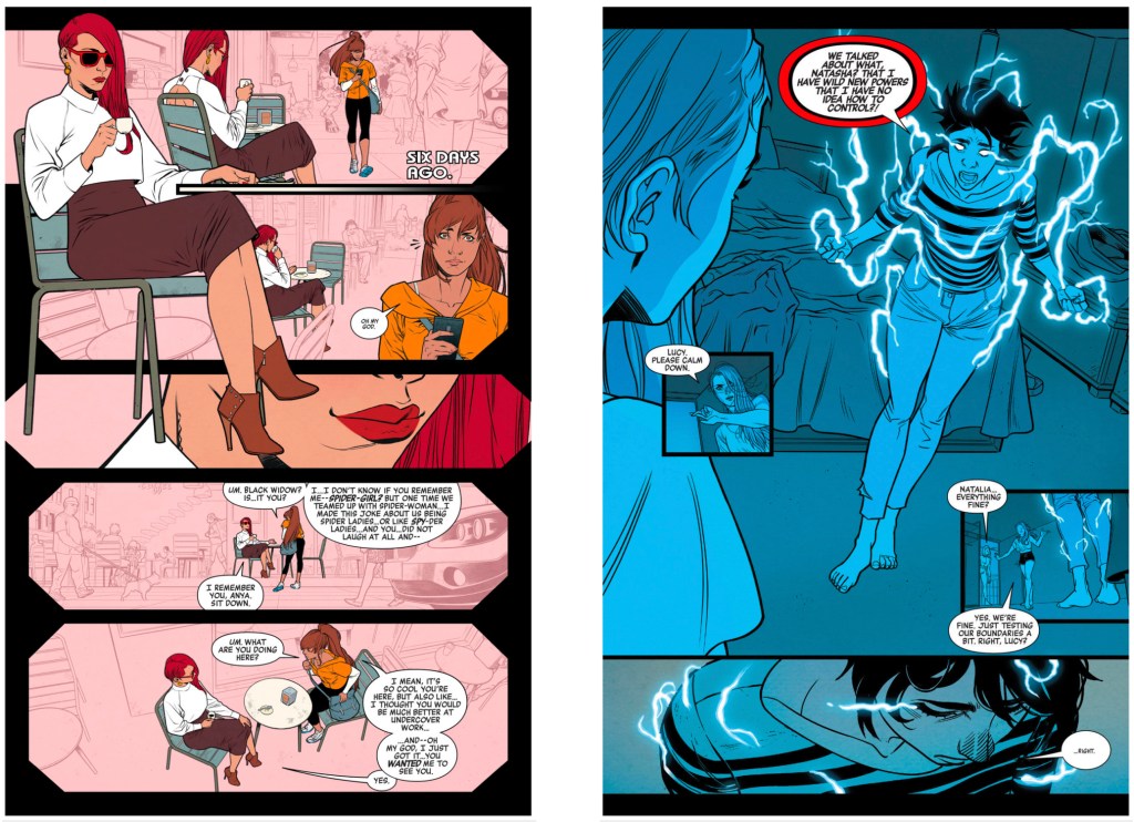 In issue 7, Natasha interacts with Spider-Girl and Lucy, characters that highlight elements of the complexities involved with being a superhero as they are compounded by also being a woman (as well as issues related to age).