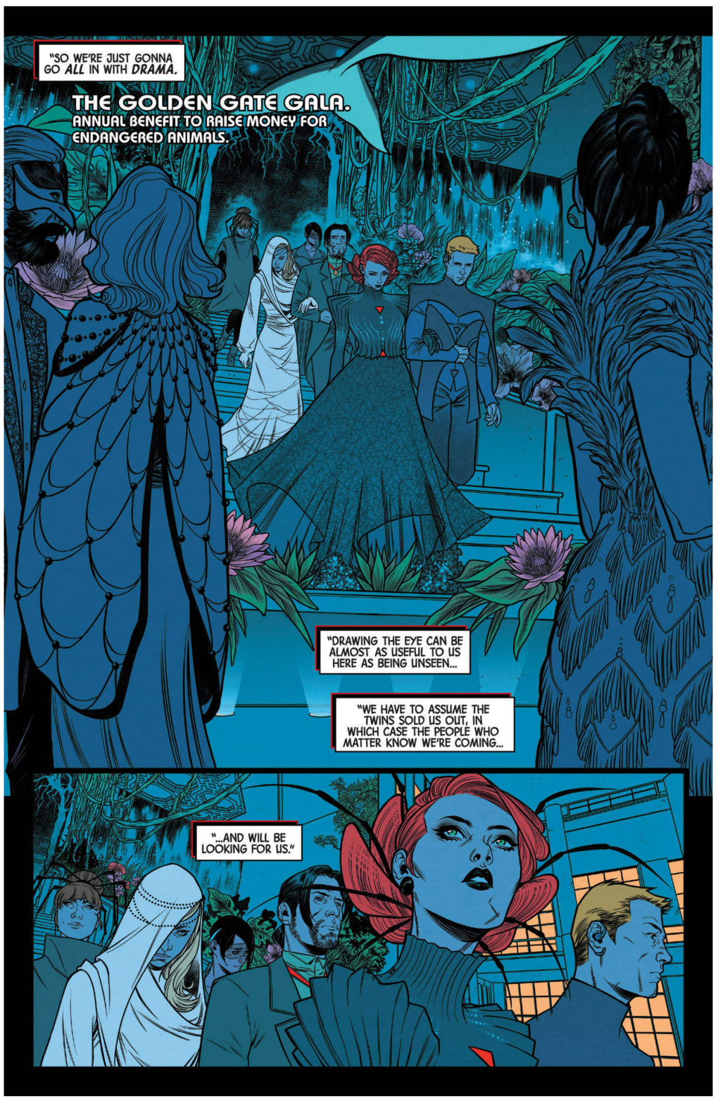Issue 2 highlights the wonderful use of color motifs by Bellaire; here the vibrant red with Natalie/Natasha and green with the introduction of Arcade.