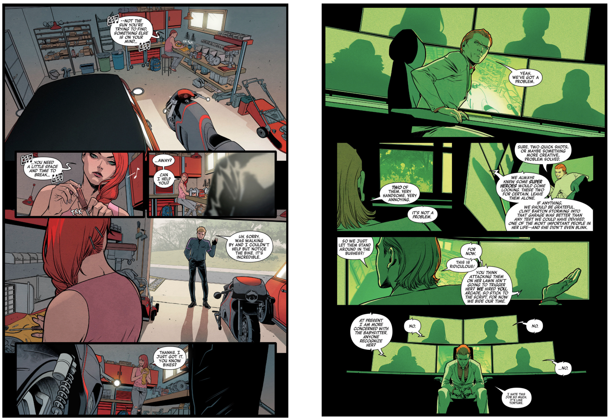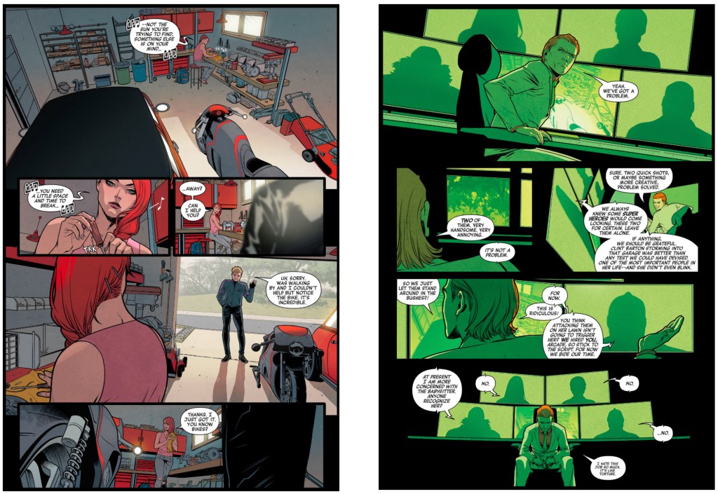 The tensions, romantic and otherwise, between Natasha and Clint as well as between Natasha and Bucky are emphasized in issue 5 as Natasha grapples with the new reality of a manufactured family that she loves and must abandon to protect.