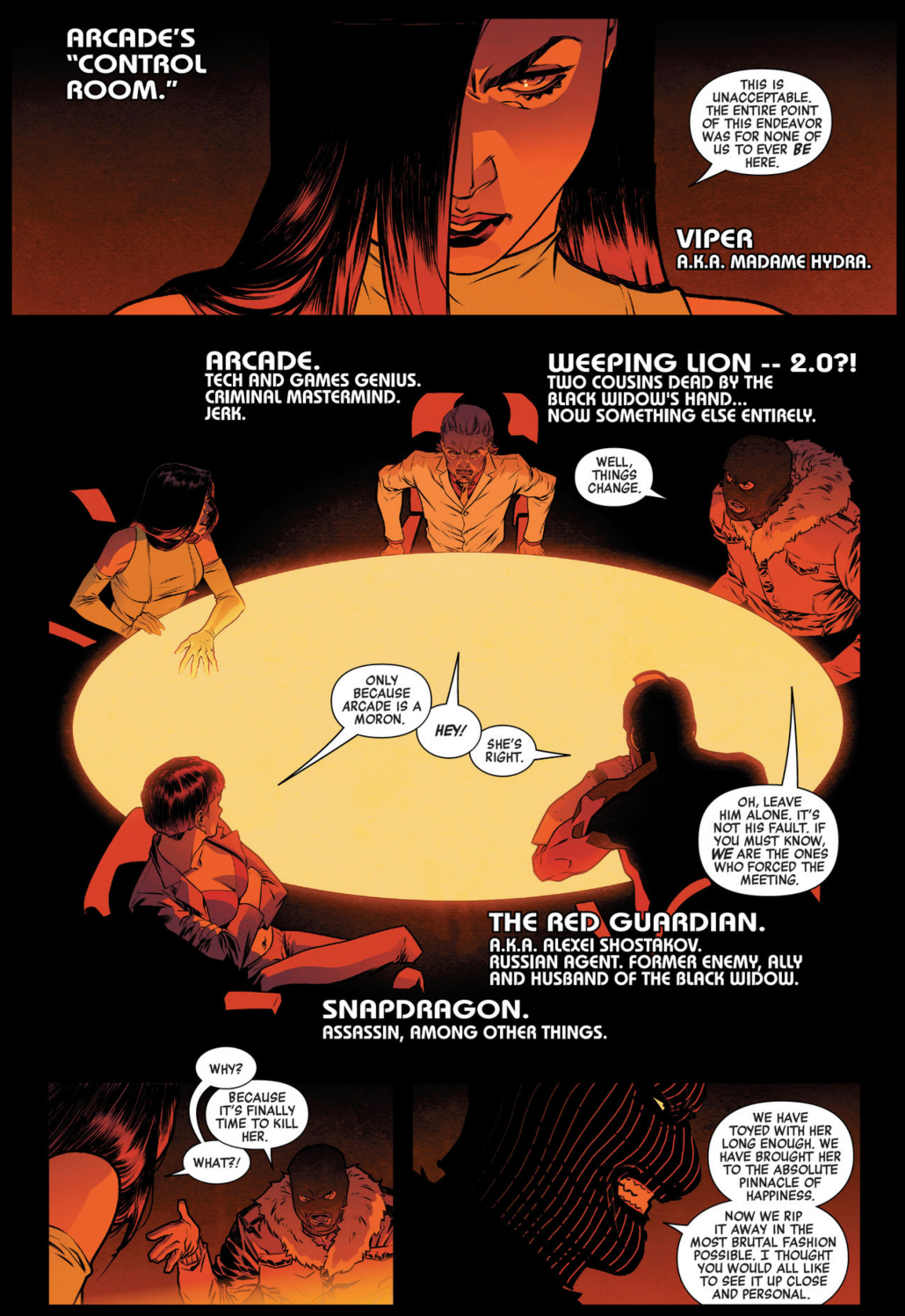 The access she secures leads to Natasha discovering that Weeping Lion is part of a duo, including the telepath brother Ilija Knezevic in issue 006. Black Widow now turns the focus of the plot to her confronting the Headmistress and Recluse to rescue the girls from the Dark Room.