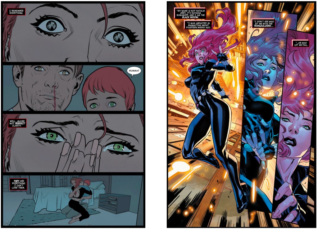 The next test is Tony Stark/Iron Man joining issue 006, mixed with another flashback of Natasha’s life as a ruthless assassin. The Stark scene shows Natasha manipulating Stark: “Makeup and acting, Tony. You’ve always been a sucker for both. Thanks for the access.”