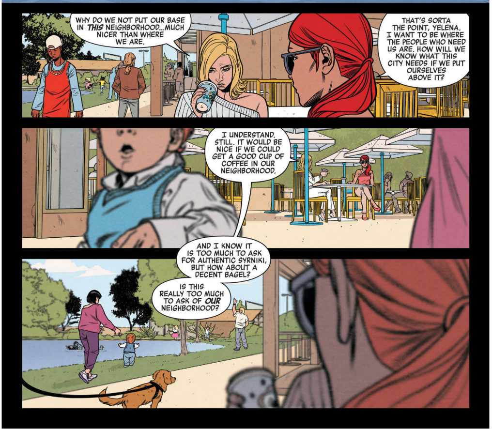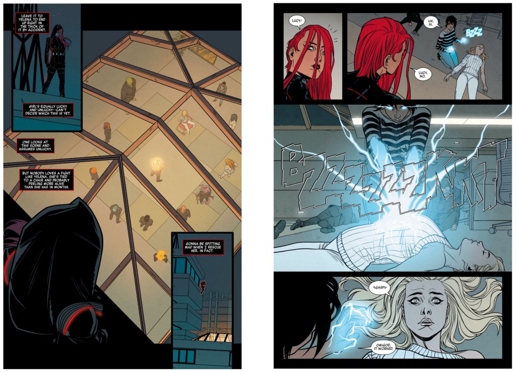 Thompson’s work as writer for this volume excels in the complex and rich portrayal and development of the characters, notably the women. Like Natasha, Yelena stands out in Thompson’s care for the character.