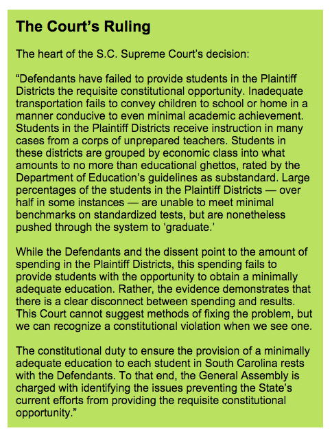 The Supreme Court in SC, in fact, finally ruled on a court case made infamous by the documentary Corridor of Shame [1], true, but the ruling addresses inadequate state support for high-poverty communities and their schools:
