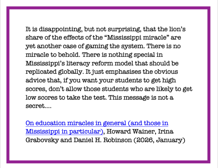 It is disappointing, but not surprising, that the lion’s share of the effects of the “Mississippi miracle” are yet another case of gaming the system. There is no miracle to behold. There is nothing special in Mississippi’s literacy reform model that should be replicated globally. It just emphasises the obvious advice that, if you want your students to get high scores, don’t allow those students who are likely to get low scores to take the test. This message is not a secret….