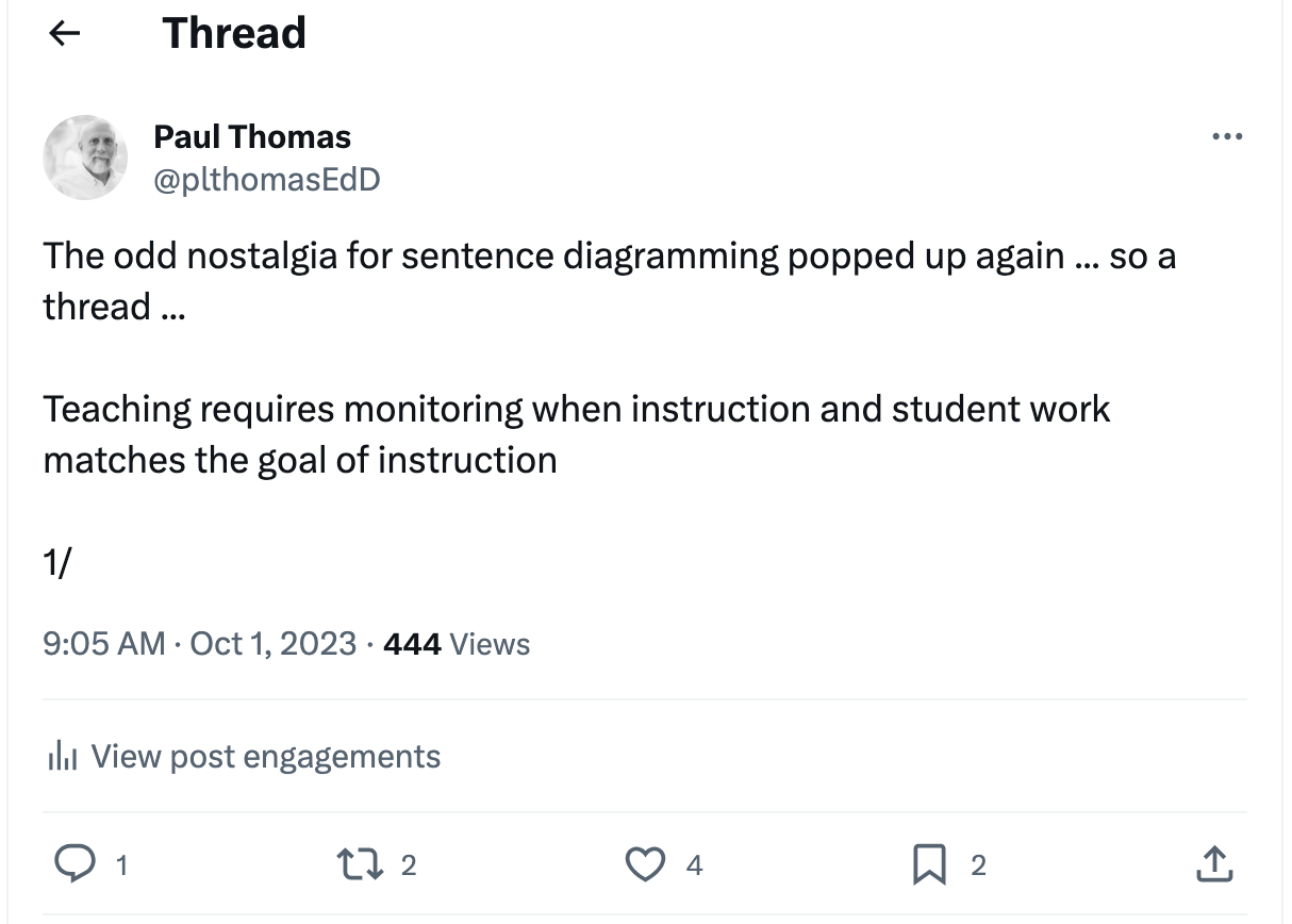 The odd nostalgia for sentence diagramming popped up again so a thread that builds on an older post of mine—Diagramming Sentences and the Art of Misguided Nostalgia: