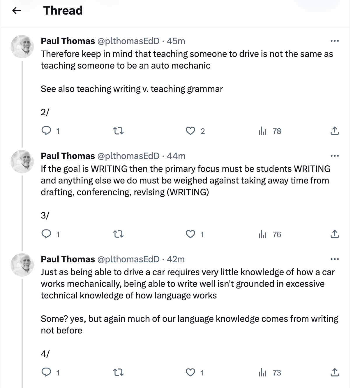 Once again on NCTE’s Connected Community’s Teaching and Learning Forum questions about teaching grammar surfaced, and as I often do, I thought about how we learn to drive cars.