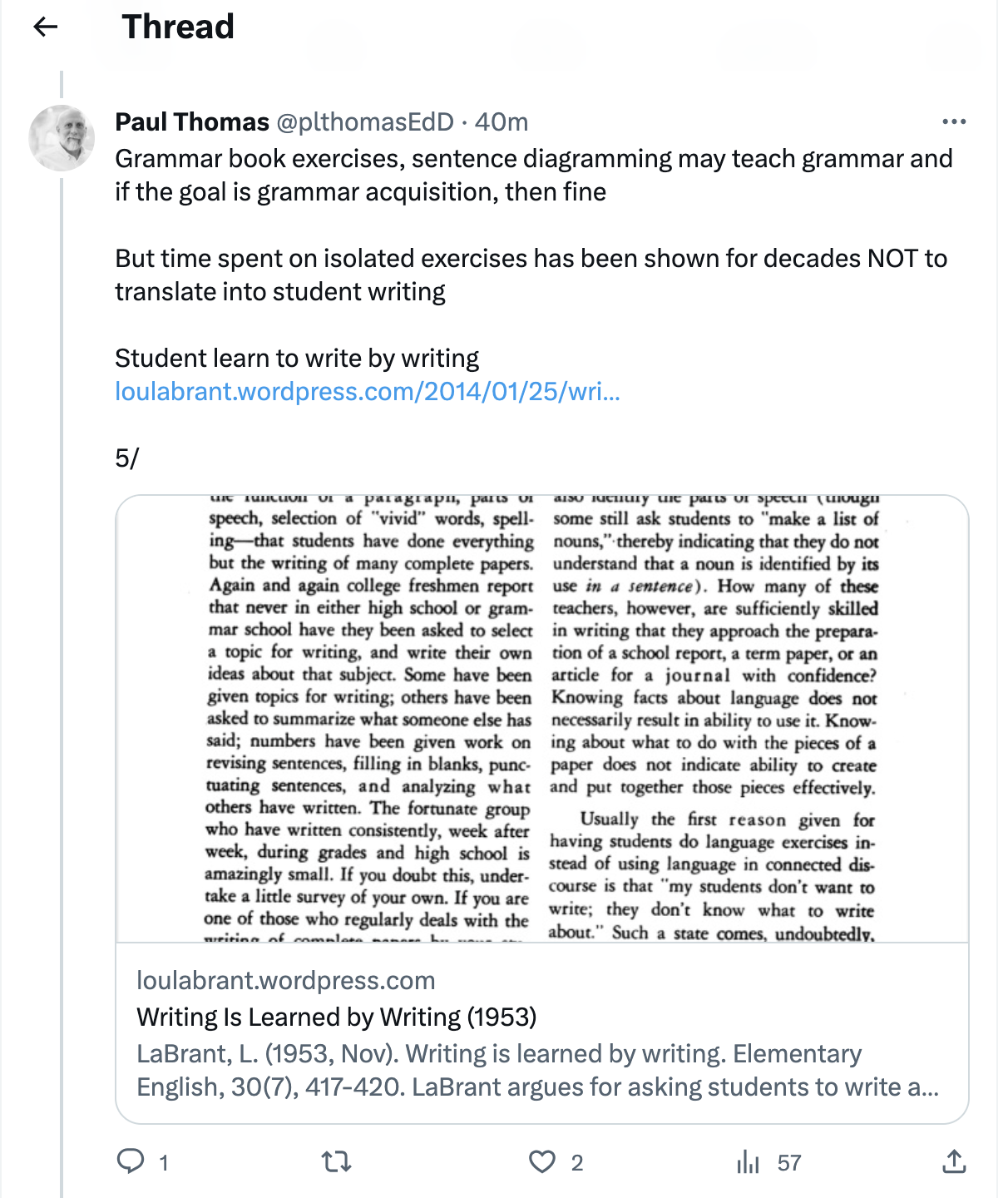 Just as the recalcitrant grammar debate spurs in me nostalgia for my formative years gaining the All-American rite of passage, driving, it also pulls me once again to my (abrasive) muse, former NCTE president Lou LaBrant, who confronted in 1953: “It ought to be unnecessary to say that writing is learned by writing; unfortunately there is need.”