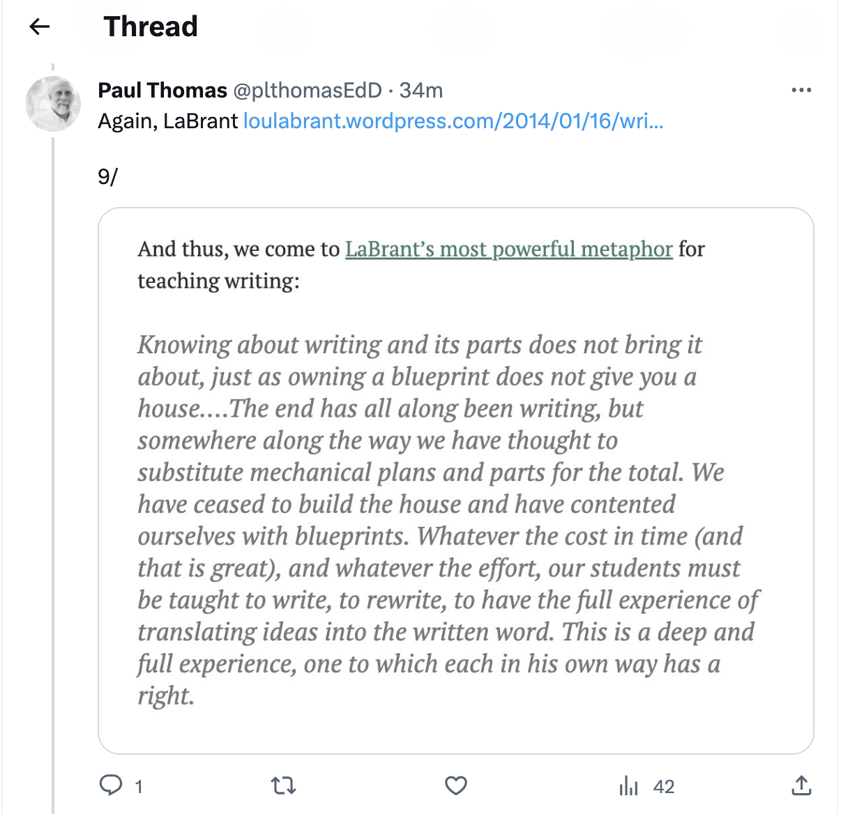 Ultimately, then, when our goal is to foster students as writers, let’s critically interrogate our own assumptions about what students must have to learn to write, and then let’s be vigilant about protecting that goal; in other words, prioritize the time students have to practice the full writing process in low-stakes and supportive environments over time spent on isolated and direct instruction that detracts from that foundational commitment.
