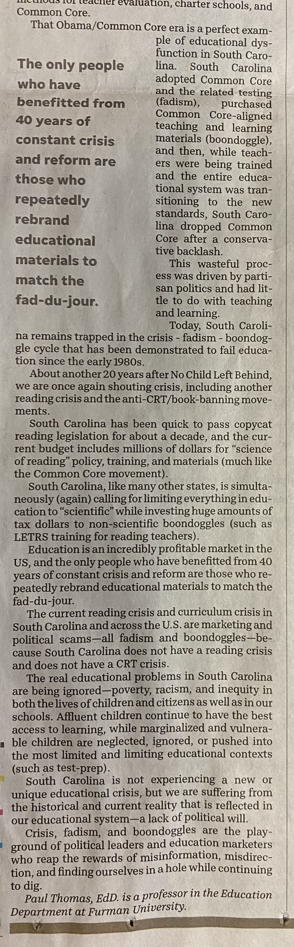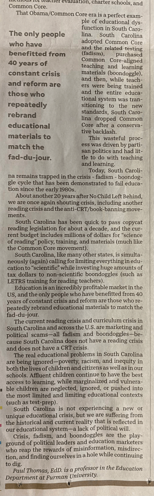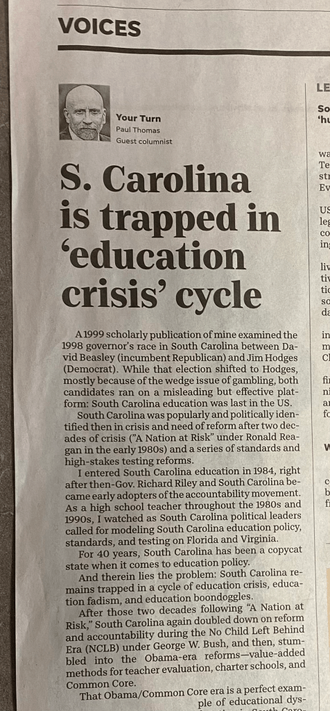 Commentary, Education, education reform, Greenville News Op-Ed: S. Carolina is trapped in ‘education crisis’ cycle (Greenville News) Image January 1, 2023 plthomasedd Recommended See Also UPDATED: Mainstream Media in (Perpetual) Crisis: More Education Meat Grinder Education Pendulum? No, Meat Grinder