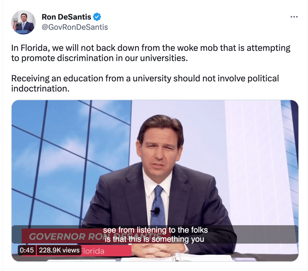 Most of us, especially on the left, completely agree with a sincere charge that “a university should not involve political indoctrination,” and therefore, we would be forced to point out that Florida and other Republican-led states are rushing to create exactly that—universities that are nationalistic and Christian-based political indoctrination.