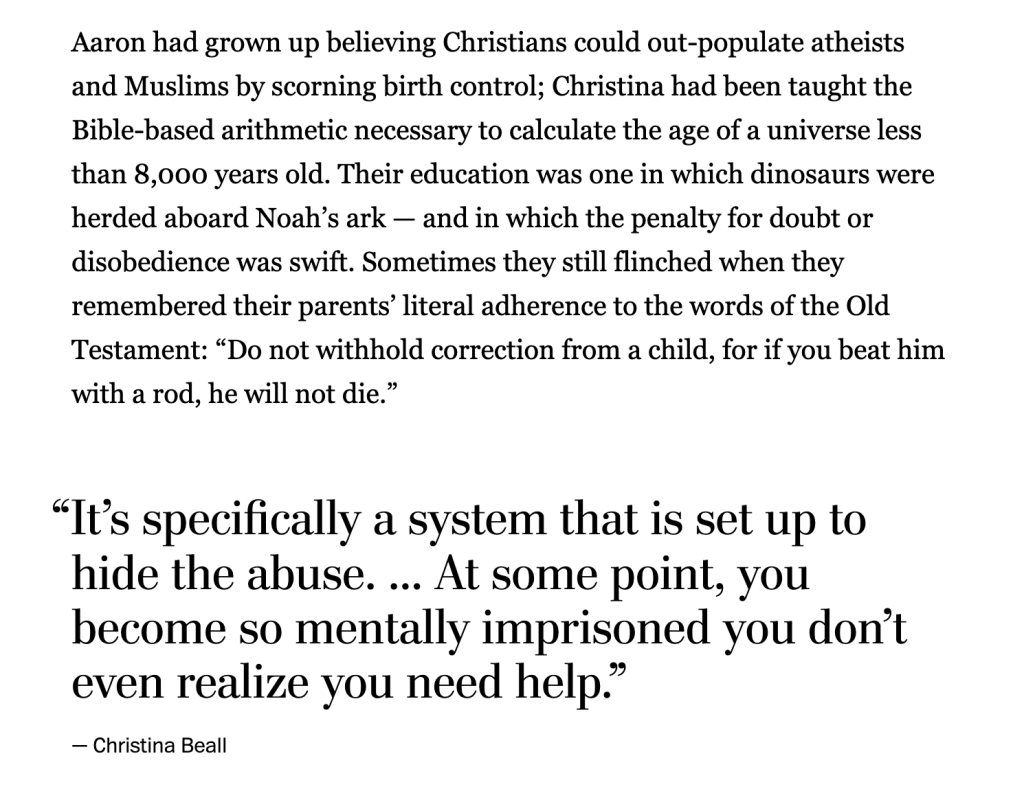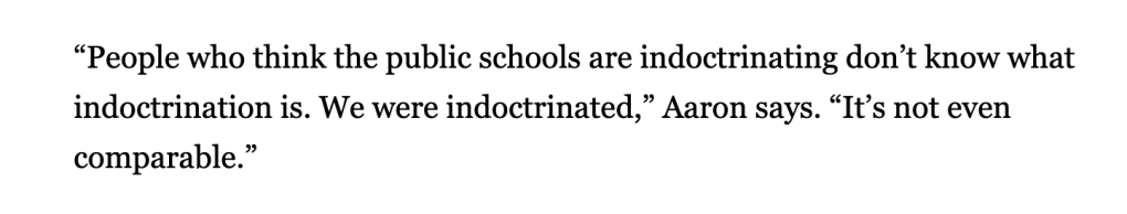 Corporal punishment, aversion to different ideas, a fear of books, and, most chilling of all, “to reshape America according to biblical principles.”
