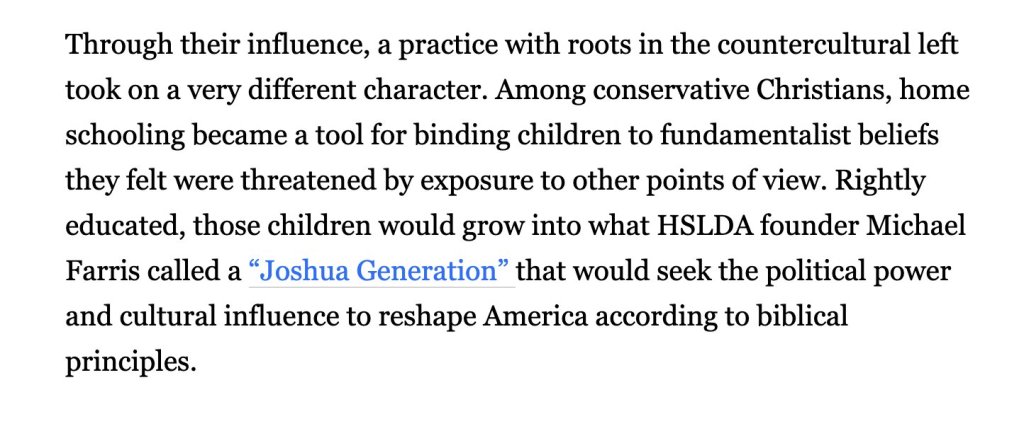 If you want to know what that end game looks like, take a peak inside the world of Christian conservative homeschooling: The revolt of the Christian home-schoolers by Peter Jamison.