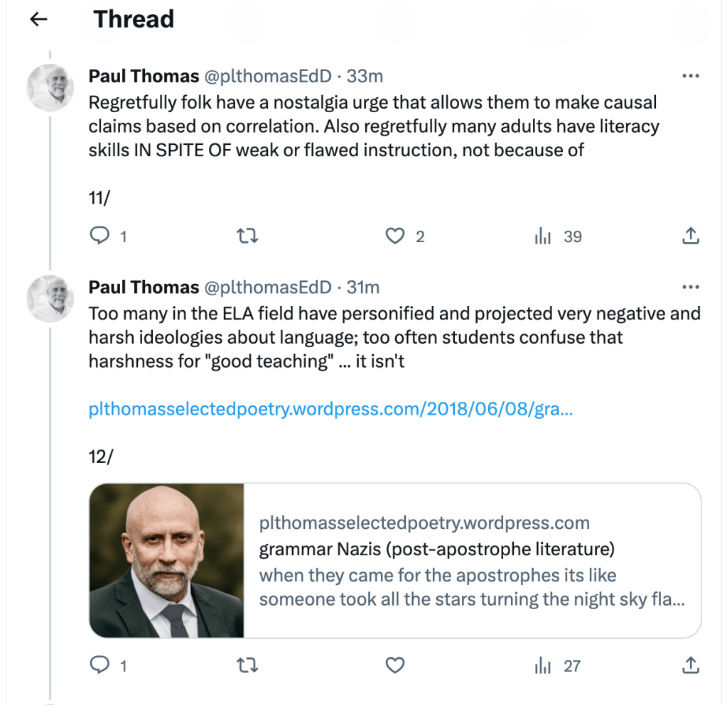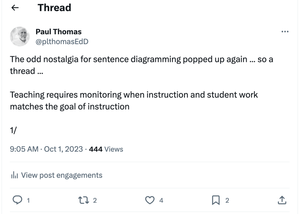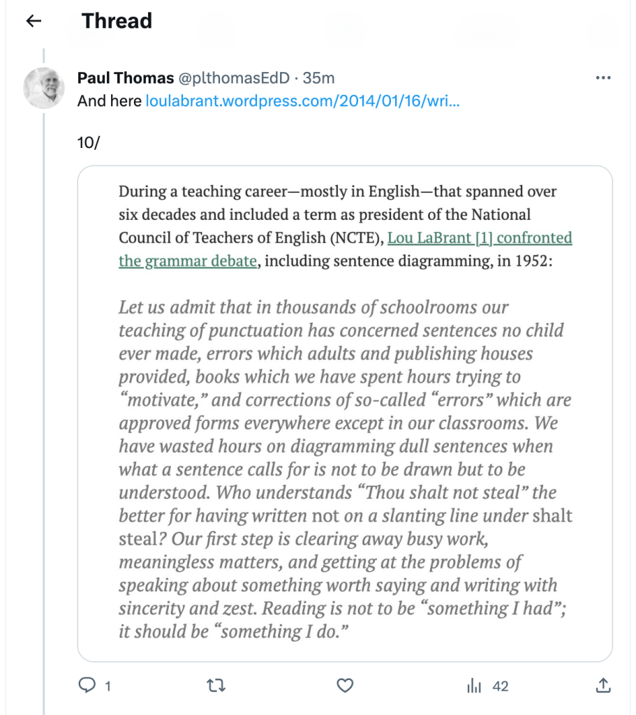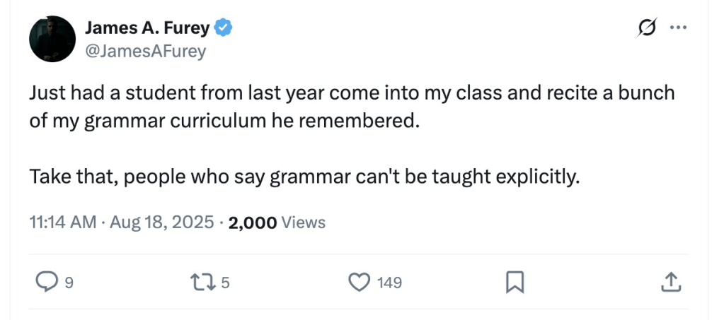 Here, then, I am going to expand some on a third point: Furey clearly does not understand the issue he seems to be attacking, grammar instruction (with the implied agents being woke progressives who worship at the alter of discovery learning).