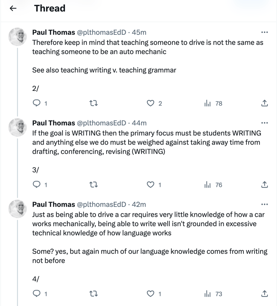 So let me be clear: Teaching students to write without direct instruction would be inexcusable, but teaching grammar through direct and isolated instruction is malpractice when our goal is teaching writing.
