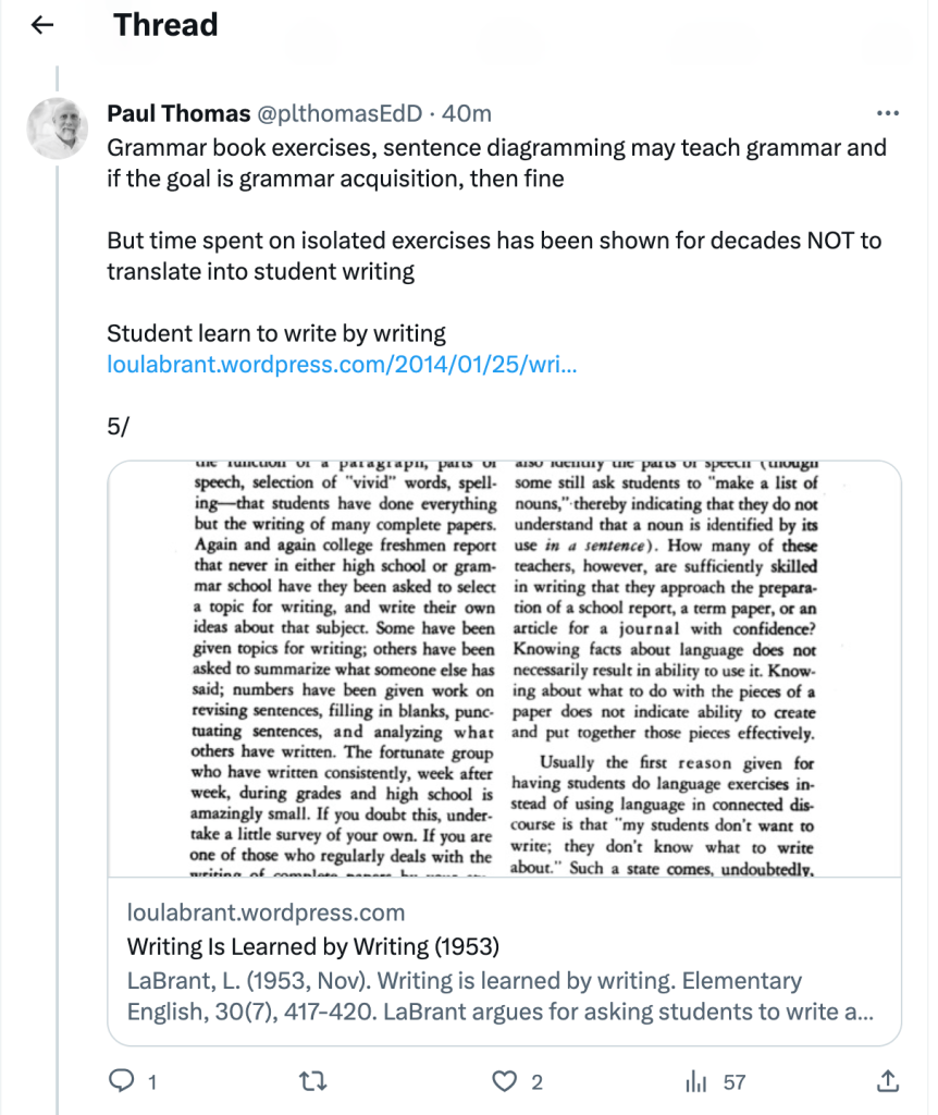 There is a long and deep research base reaching back into the early 1900s showing that direct (isolated) grammar instruction fails to transfer into student writing and can even have negative outcomes for the quality and amount of student writing.