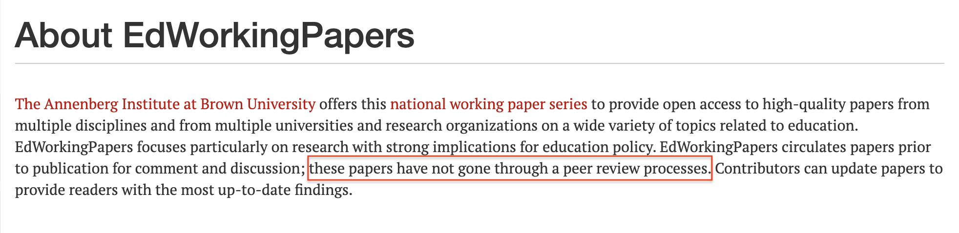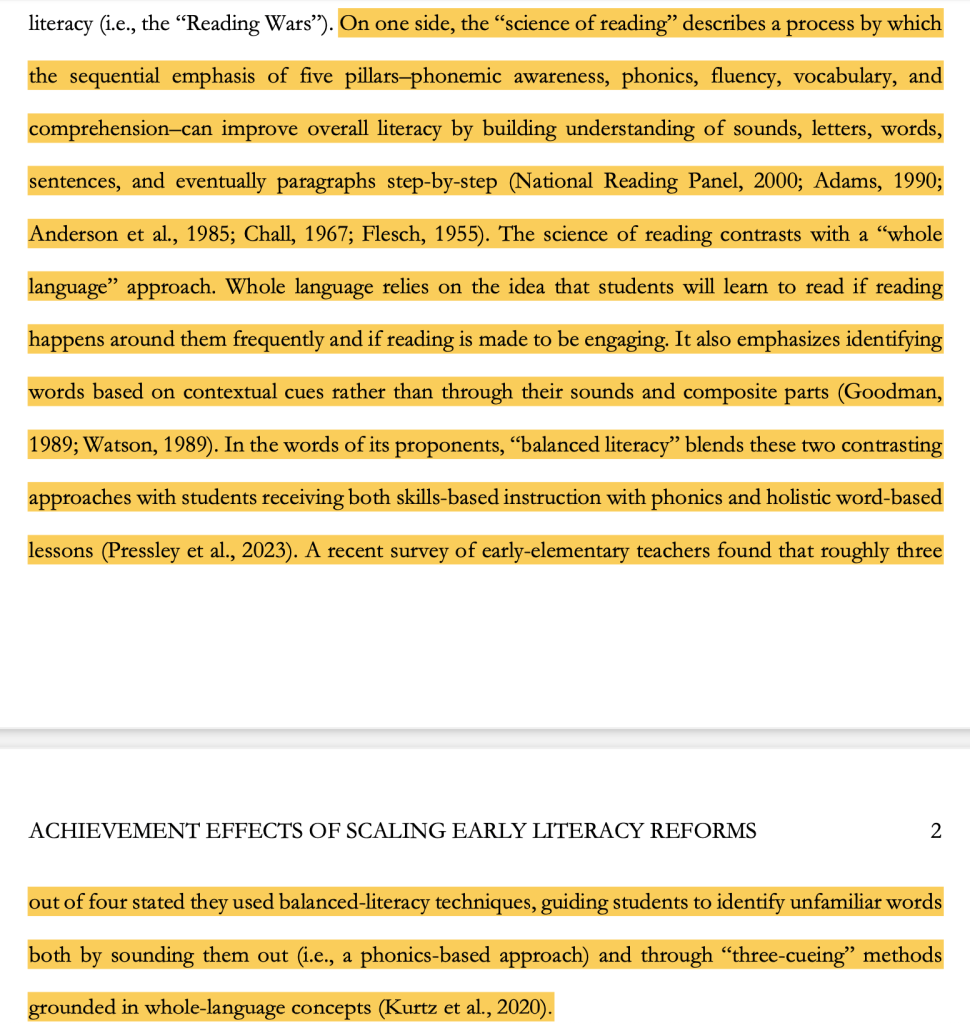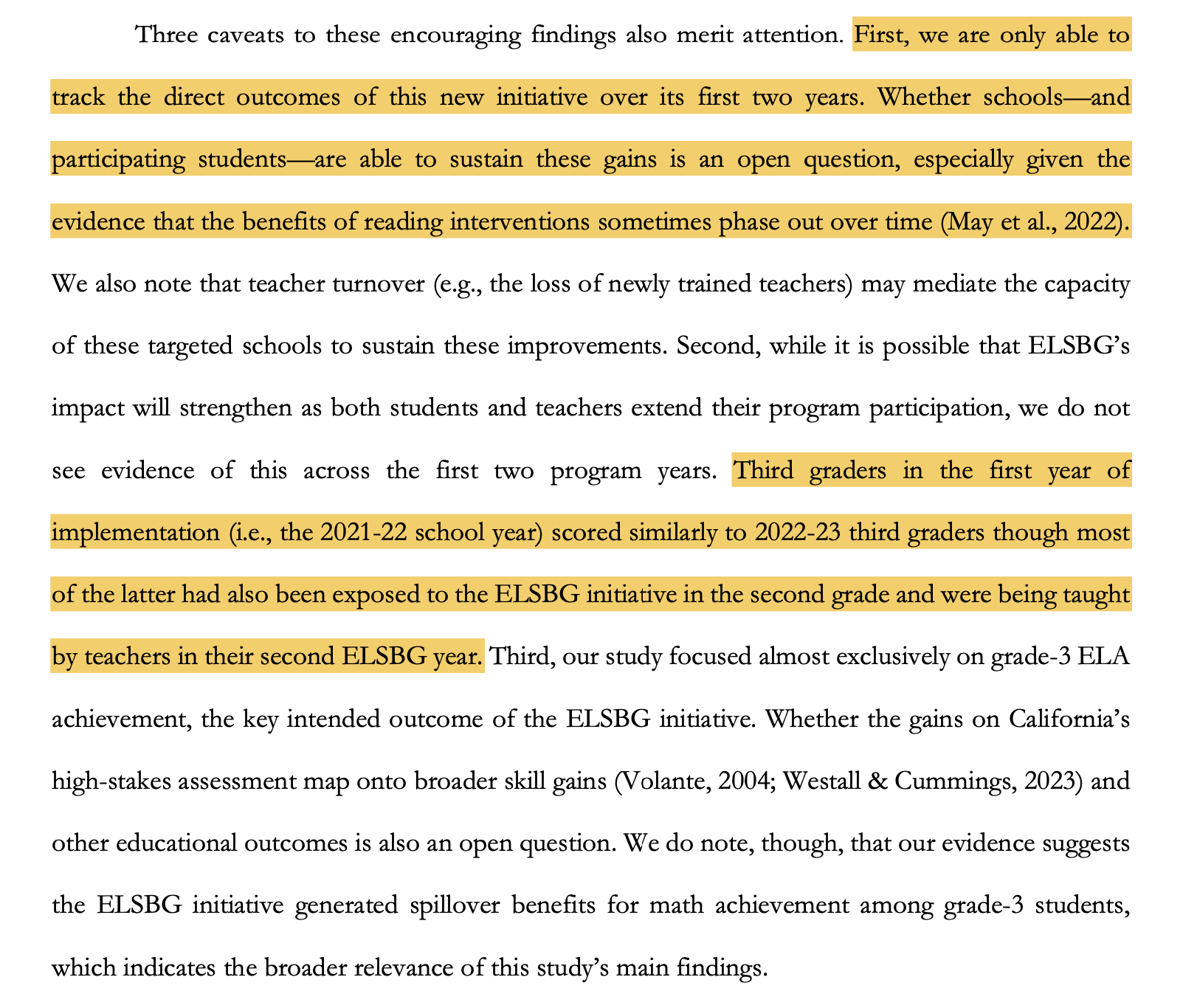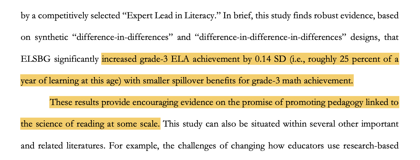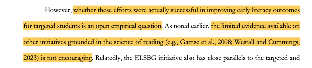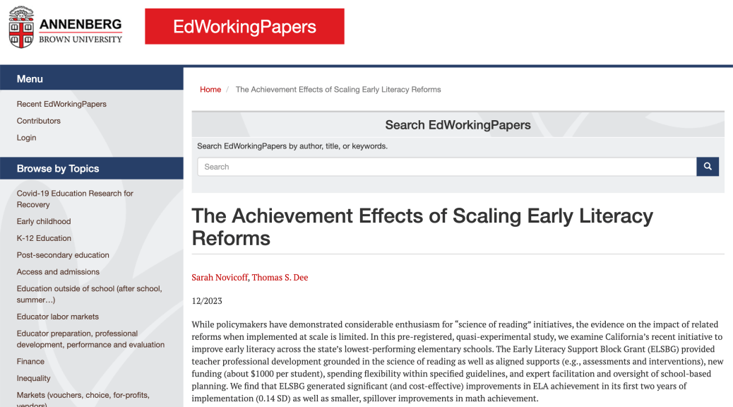 And as noted by Barshay: “The working paper, ‘The Achievement Effects of Scaling Early Literacy Reforms,’ was posted to the website of the Annenberg Institute for School Reform at Brown University on Dec. 4, 2023. It has not yet been published in a peer-reviewed journal, and may still be revised.”