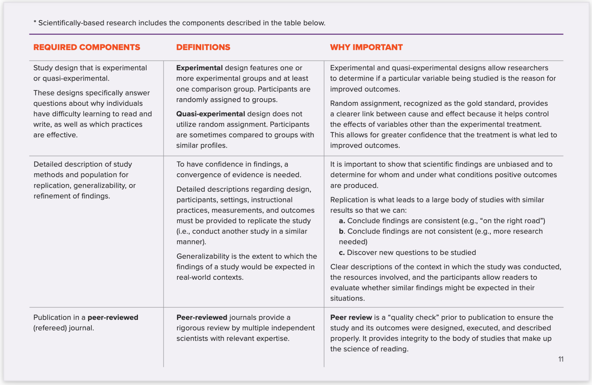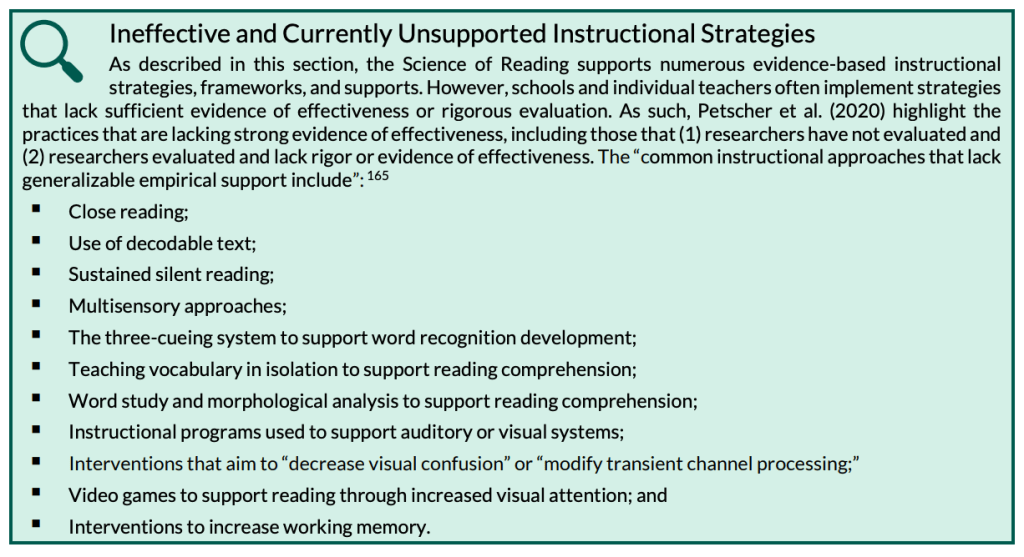 Simultaneously narrowing the reading science to only experimental/quasi-experimental research while using as evidence anecdotes and endorsing practices (grade retention, systematic phonics instruction for all students) and programs (LETRS, Orton-Gillingham) lacking scientific support.