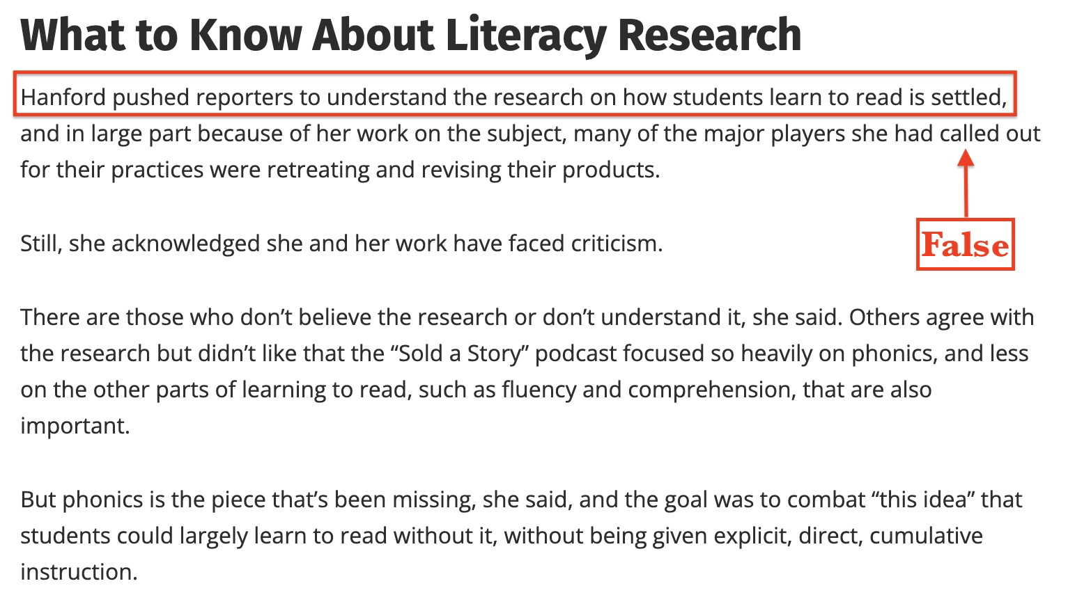When Hanford makes huge claims about teachers being unprepared to teach reading (“But a lot of teachers don’t know this science“), the link provided circles back to her own journalism, not research, not science.