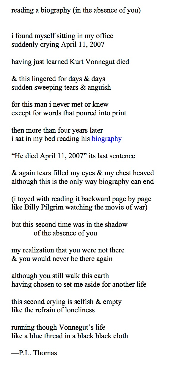 Kurt Vonnegut, poetry, reading a biography (in the absence of you) Poem: reading a biography (in the absence of you) November 11, 2022 plthomasedd [NOTE: Reposting from 2015 to commemorate year 100 of Kurt Vonnegut’s birth 11 November 1922]