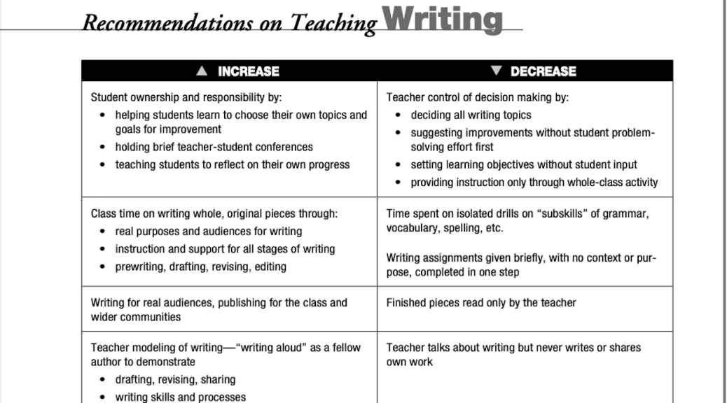 Let me note here that what made the original best practice approach a wonderful methods text is that the instructional practices were recommended as “increase” or “decrease”—not mandate or ban: