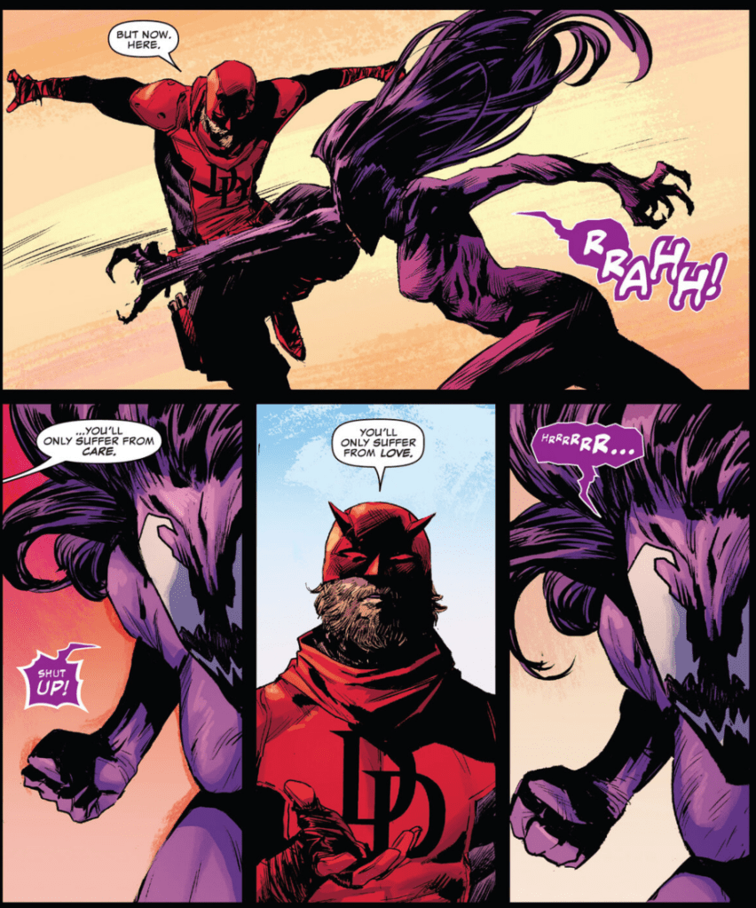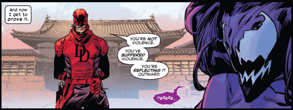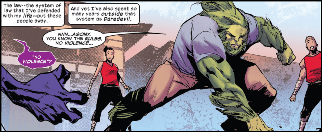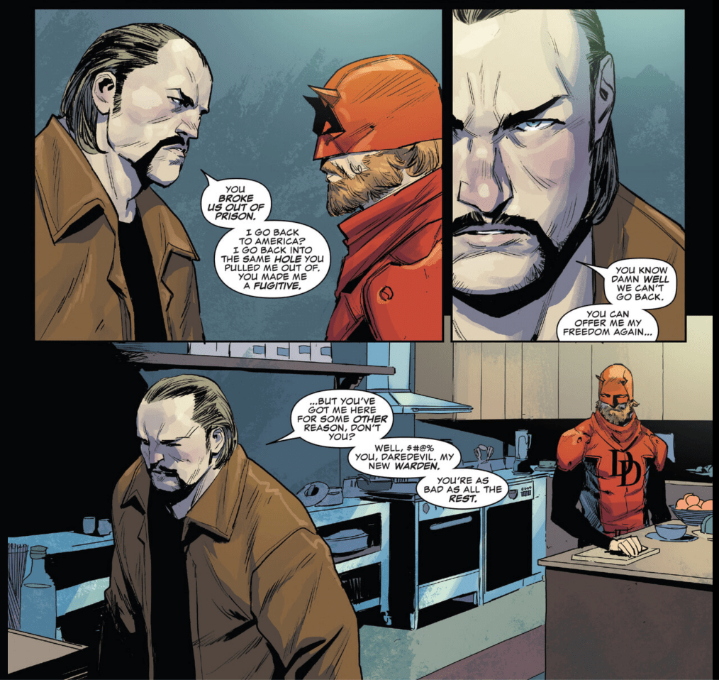 Daredevil’s commitment to restorative justice is dramatized in an exchange with Bullet: