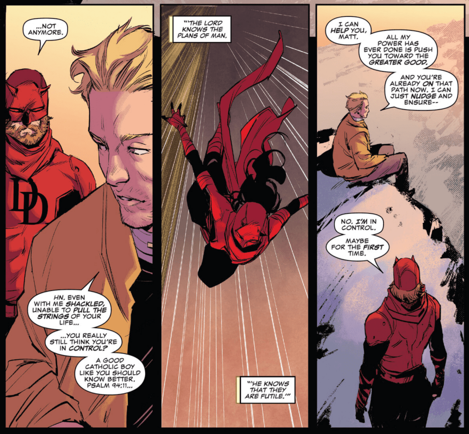 From issue 5—”This is God’s plan”—to issue 6—”The Lord knows the plans of man”—Psalm 94:11 pulls the reader back from Daredevil’s idealism, suggesting that despite his best intentions, his mission is “futile.”