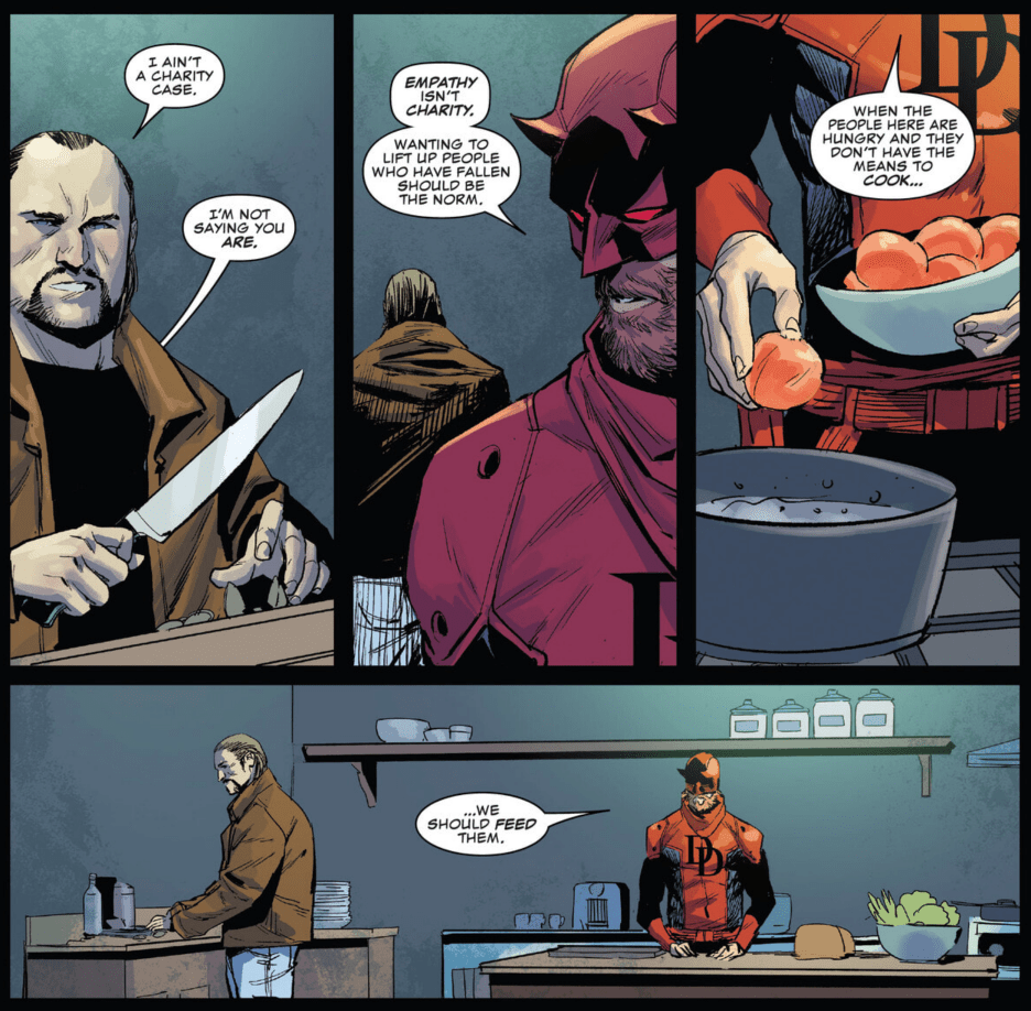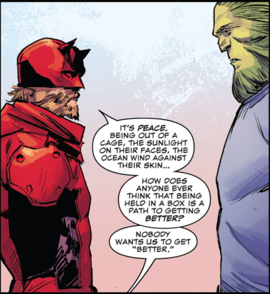 Criminals are a consequence of social forces, Daredevil argues, and thus, he seeks a way to use love and compassion to help those labeled “criminals” regain their humanity.