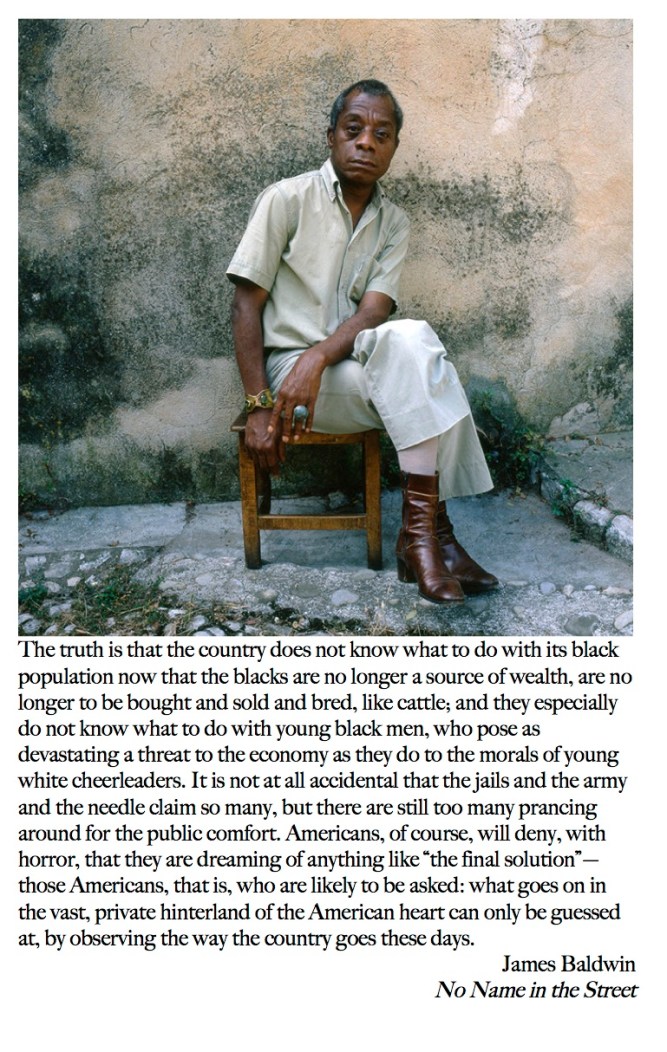 The truth is that the country does not know what to do with its black population now that the blacks are no longer a source of wealth, are no longer to be bought and sold and bred, like cattle; and they especially do not know what to do with young black men, who pose as devastating a threat to the economy as they do to the morals of young white cheerleaders. It is not at all accidental that the jails and the army and the needle claim so many, but there are still too many prancing around for the public comfort. Americans, of course, will deny, with horror, that they are dreaming of anything like “the final solution”—those Americans, that is, who are likely to be asked: what goes on in the vast, private hinterland of the American heart can only be guessed at, by observing the way the country goes these days. (pp. 432-433)