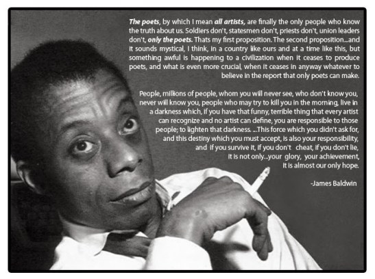 To join in with this celebration, I want to recommend primarily that Baldwin’s voice be read and viewed/heard—that we do not allow all being said and written about him to suffice. And on August 2, 2014, we have so much of Baldwin before us, so much that we have failed to embrace, to consider carefully, to allow these words to complete their unmasking: