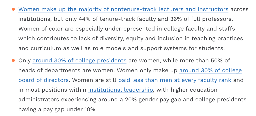 K-12 teaching (especially elementary teaching) is disproportionately a woman’s career since about 8 in 10 public school teachers are women. And while teacher pay is low compared to other professions, the pay inequity is more pronounced in areas where the proportion of women is even higher at the elementary level (Will, 2022). As a frame of reference, a more respected and better rewarded teaching profession is in higher education where professor have professional autonomy, except the gender imbalance exposes a similar sexist pattern. While the gender balance is better in higher education than K-12, the pay and security of being a professor increases where men are a higher proportion of the field (Quinn, 2023).