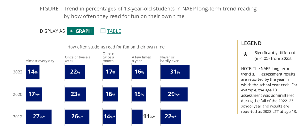 The United States is obviously not getting a sufficient return on investment in elementary and secondary education, as it has mediocre scores in mathematics literacy and declining scores for science literacy for 15-year-old students surveyed in 2022. The only significant improvement for 15-year-olds is in reading, where the United States finally entered the top 10 in 2022.