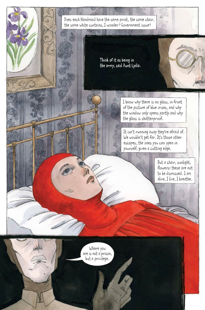 My strongest quibble of the graphic adaption is that the Historical Notes section feels far too clipped, but in many ways, in the novel, it serves to reinforce much of the language and academic elements of the story. Noting this small weakness also highlights that the graphic novel tends to lose the humor, albeit very dark, weaved throughout by Atwood.