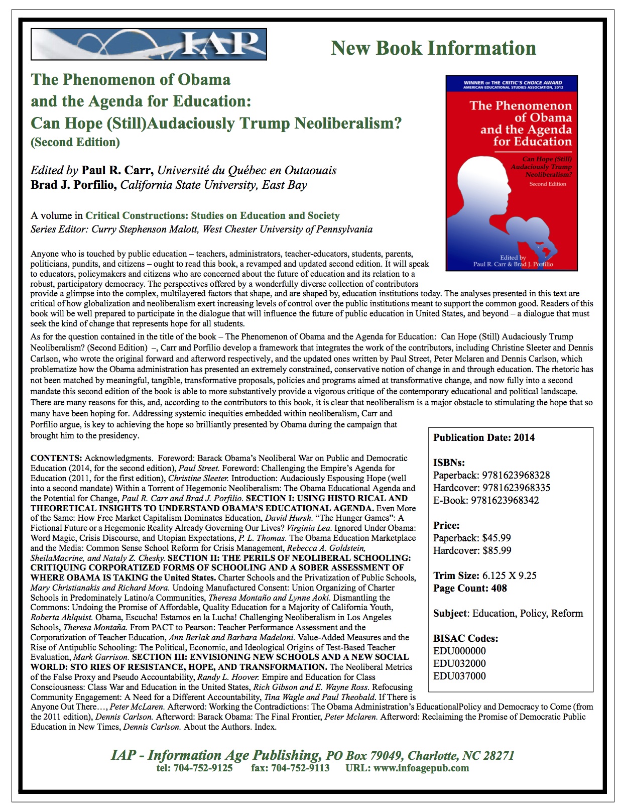 Carr, P.R., & Porfilio, B.J. (2011b). The Phenomenon of Obama and the agenda for education: Can hope audaciously trump neoliberalism? Charlotte, NC: Information Age Publishing.