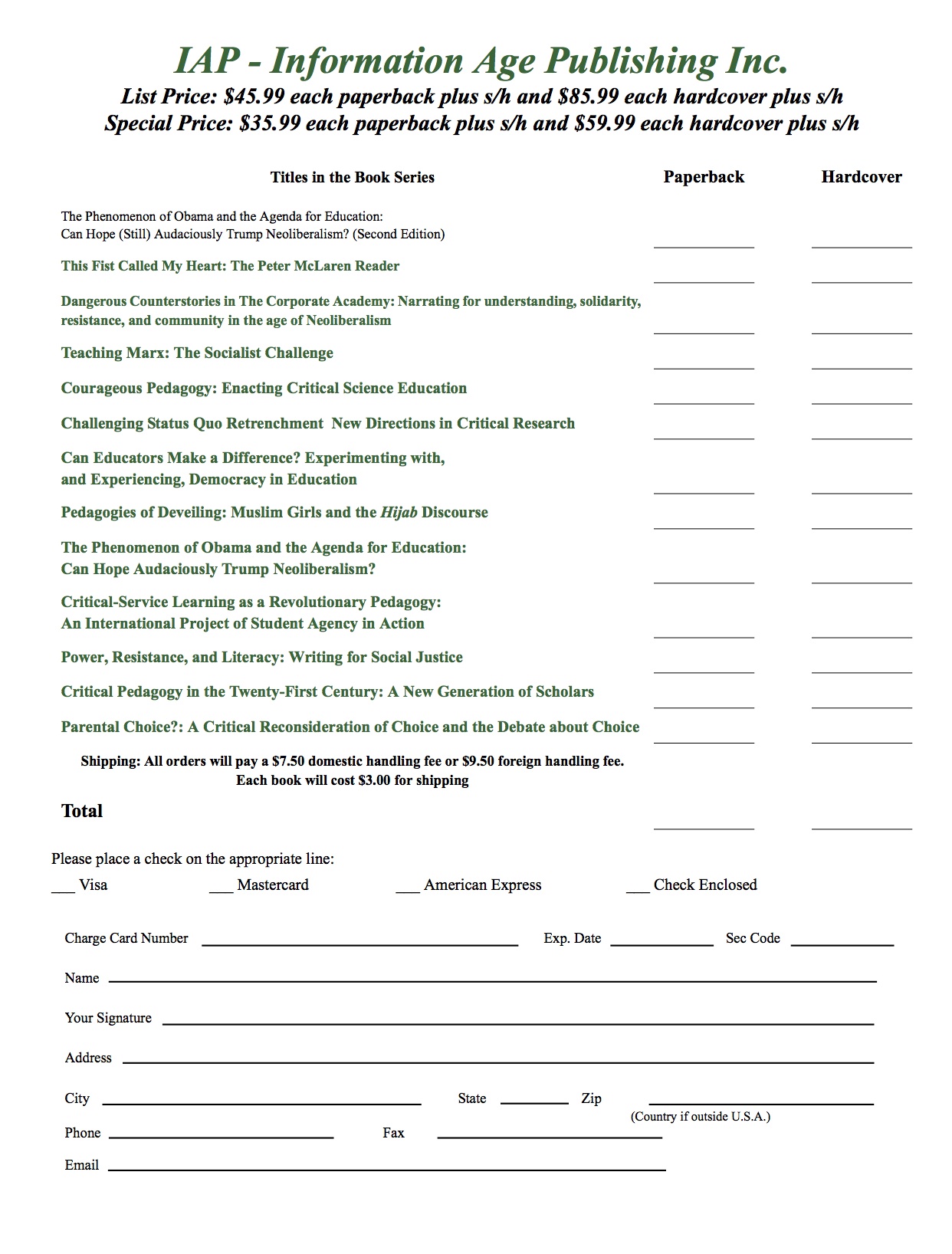 The Neoliberal Metrics of the False Proxy and Pseudo Accountability, Randy L. Hoover. Empire and Education for Class Consciousness: Class War and Education in the United States, Rich Gibson and E. Wayne Ross. Refocusing Community Engagement: A Need for a Different Accountability, Tina Wagle and Paul Theobald. If There is Anyone Out There…, Peter McLaren. Afterword: Working the Contradictions: The Obama Administration’s EducationalPolicy and Democracy to Come (from the 2011 edition), Dennis Carlson. Afterword: Barack Obama: The Final Frontier, Peter Mclaren. Afterword: Reclaiming the Promise of Democratic Public Education in New Times, Dennis Carlson. About the Authors. Index.