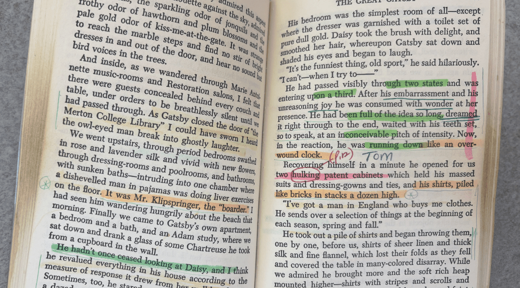 Students begin what amounts to an Easter egg hunt; there’s lots of green and yellow (gold) throughout the novel (hint: money), and the job students have is to find the color and identify the symbolism. (It’s how we ruin poetry, for example.)