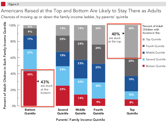 From Pew’s Economic Mobility Project data; analysis by Bruenig, 2013, June 13: “As far as income mobility goes, you are 10x more likely to wind up in the richest fifth as an adult if you were born there than if you were born in the poorest fifth.”