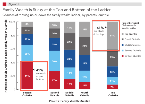From Pew’s Economic Mobility Project data; analysis by Bruenig, 2013, June 13: “As far as wealth mobility goes, you are more than 5x more likely to wind up in the wealthiest fifth as an adult if you were born there than if you were born in the least wealthiest fifth.”