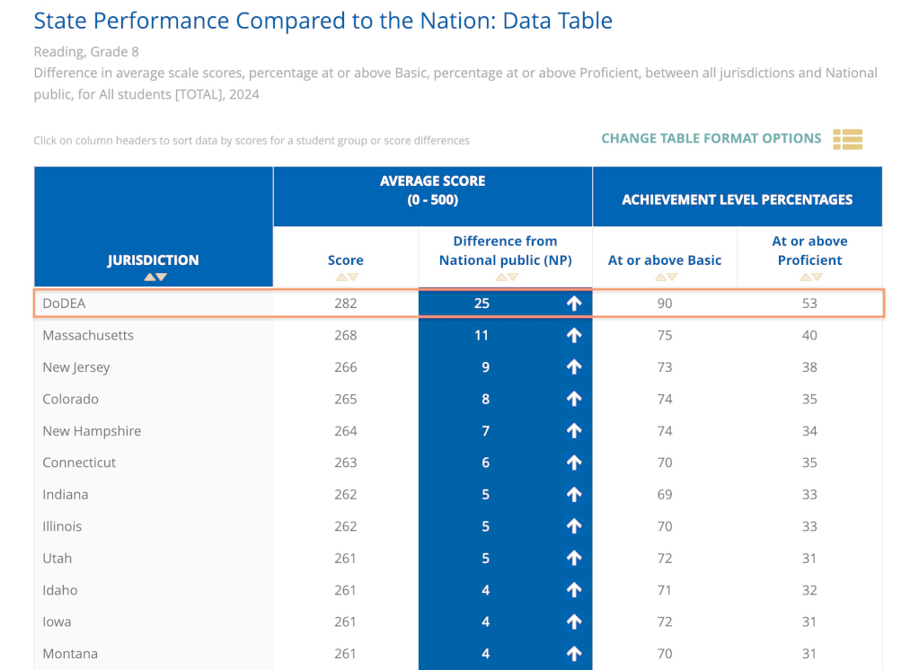 However, two analyses [1] have shown that that score increase appears to be the result of grade retention and not instructional, teacher, or program reforms. Both MS and FL have seen their outlier grade 4 reading scores drop into the bottom 25% of state scores by grade 8, suggesting the grade 4 scores are the product of corrupting the pool of students tested through grade retention and not genuine increases in reading proficiency. Again contrast MS and FL with DoDEA schools in grade 8 (top image is the top performing states and bottom image is the bottom performing states):