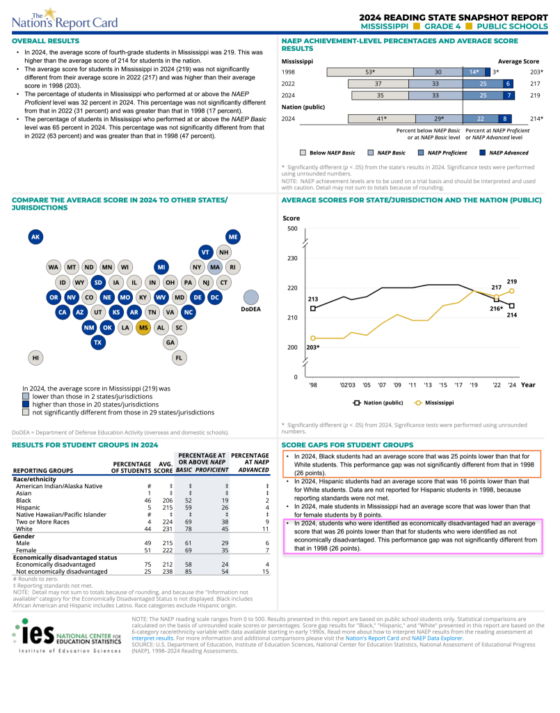 Mississippi has the same race and poverty achievement gap in grade 4 reading as the state did in 1998: