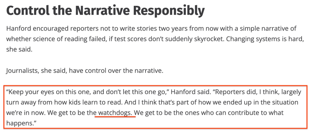 The origin stories of the “science of reading” movement is grounded, in fact, in the journalism of Emily Hanford, notably Hard Words, the ironically named Sold a Story podcast, and There Is a Right Way to Teach Reading, and Mississippi Knows It.