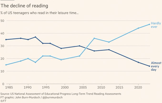 Children and teens living without food or housing security as well as with little or no access to healthcare are likely finding little time or motivation to read for pleasure, and their intellectual batteries are drained by the lives resulting in not being able to fully engage with the few hours a day for about half the year when they are in classes that may be overcrowded or taught by an un- or under-certified teacher being paid poorly and attacked as a groomer and an indoctrinator by the current political climate.